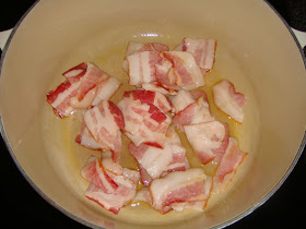 Add the chopped bacon & cook until crispy. Drain on a paper towel lined plate & reserve.