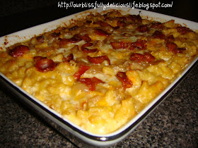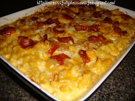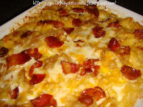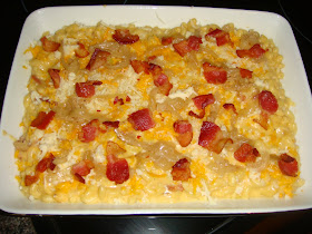 Pour the macaroni & cheese mixture into a 9 X 13 casserole dish that has been been coated with non stick spray. Top with the reserved bacon, caramelized onions, & cheese.