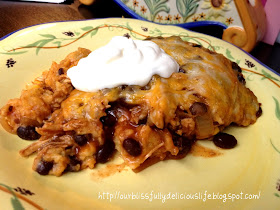 Pinch of Yum. I love her photos so I had to share one but I'm also including my finished product too. I am clearly a less talented photographer/ food stylist, but rest assured it tasted fantastic!! I'm listing the recipe the way that I made it, which is slightly different than the original so make sure you check it out too. I used chicken & black beans. I also used a round braising pan to bake it in. Pinch of Yum did hers in a pie plate. But you can use any casserole type dish that you'd like & substitute ingredients per taste!
